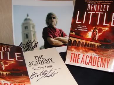 Here's your chance to win a signed hardcover book club edition of Bentley Little's latest terror tome, The Academy. To sweeten the pot, we (gingerly) twisted our favorite dark scribe's arm and got him to sign a color 8x10 Academy publicity shot. (The author photo was an exclusive signing just for us that the candid scribe says was a one-time deal.)